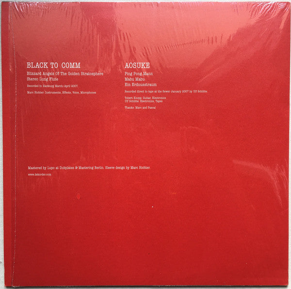 Black To Comm recorded in Hamburg, March/April 2007. Aosuke recorded direct to tape at the Sewer, January 2007. Mastered at Dubplates & Mastering, Berlin. Limited edition of 500 copies.