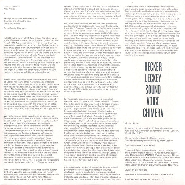 Produced on the occasion of 'Tate Modern Live: Push and Pull, a two day performance event', London, 18 -19 March 2011 Ch-ch-chimeras © Alex Kitnick Processed cover images: [..., original photography [..., 3 Channel Chronics by [..., MUMOK, Vienna Courtesy Florian Hecker, Sadie Coles HQ London and Gallerie New, Berlin. Mark Leckey GreenScreenRefrigerator: original photography by [..., New York courtesy Mark Leckey and Gavin Brown's enterprise, New York. Mastered + cut at D&M, Berlin © Hecker, Leckey. PAN 2015 p-a-n.org From PAN website: "On the PAN release itself, channel 1 from Hecker Leckey Sound Voice Chimera corresponds with side A and channel 2 with side B; channel 3 is available as a monophonic mp3 download."