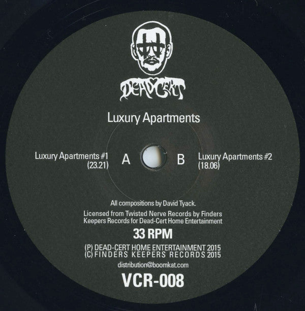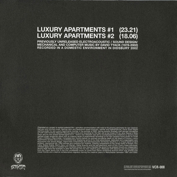 Previously unreleased electroacoustic / sound design / mechanical and computer music by David Tyack (1978-2002) Recorded in a domestic enviroment in Didsbury 2002 Originated as a project to explore potential film/animation synchronisation with nods to his growing penchants for neo-classical, fee jazz and minimal music, German born and Derbyshire raised musician, painter and mathematician David Tyack began working under his new Luxury Apartments moniker in the summer of 2002. Having recently finished a self-penned conceptual LP with Can frontman Malcolm Mooney and writing and recording for the then yet to be mixed LPs by Jane Weaver’s Misty Dixon and his own school formed band D.O.T. Dave’s new direction was set to counterbalance his ambitions to record a fully realised singer songwriter LP with an ongoing series of experimental recordings at his new compact home studio on Clyde Road in Didsbury Manchester. Completed just months before his untimely accidental death on the island of Corsica, Luxury Apartments reveals Dave at his uninhibited best displaying some of his most adventurous, dedicated and unapologetic solo excursions into sound design, improvised composition and electroacoustic territories resulting in a unique blend of dark ambient, mechanical folk, PINA stylings and coldwave DIY rhythms. Drawing comparisons to the varied works of Sorgini, Eno, Liska, Stabat Stable, Martin Zero, Luc Mariani, Walter Branchi and the lost electronic work of Don Cherry, these previously unheard tapes remain in unedited form compiled exactly how Dave intended the record to be pressed should any independent record label have the foresight to take the plunge into his new creative pool. Released with blessing and encouragement form the Tyack family this is the first unreleased music to come from Dave’s extensive archive which was shared with close friends and creative collaborators regularly during his creative years in Manchester between 1997 and 2002. (P) Dead-Cert Home Entertainment 2015 (C) Finders Keepers Records 2015