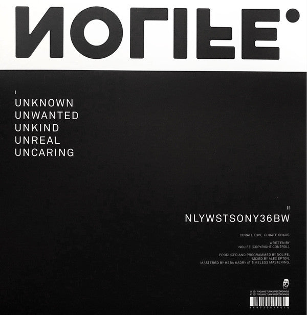Side B begins with a locked-groove (neverending loop), that will play the same groove of static noise, indefinitely. The final track, “NLYWSTSONY36BW” can be played by placing your needle past the aforementioned locked-groove. There is a second locked-groove immediately following this track.