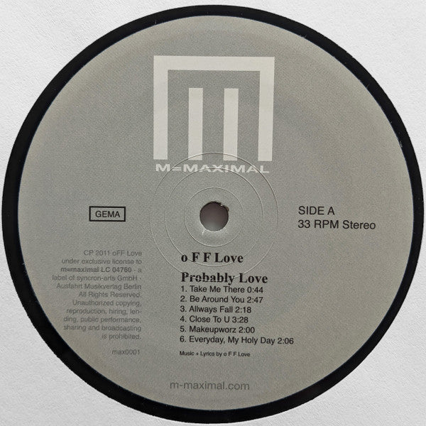 CP 2012 o F F Love under exclusive license to m=maximal LC 04760 - a label of syncron-arts GmbH Ausfahrt Musikverlag Berlin Mastered at studio.WANNSEE Made in EU