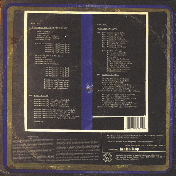 Music from film "Crashes in Love" Produced by Wilfilms Limited. "A Tragedy Of How An African Princess Rejects The Love That Money Buys" by William Onyeabor [additional notes This is a 'remixed' version of the original album released in 1977 (see [r5885152). The original version had 'normal' instrumentation of keyboards, drums, vocals, guitar and other normally recorded instruments and vocals. This version released approximately 2 years later, Onyeabor added electronically generated 'beats', some extra vocals and guitar parts and dropped the track 'Jungle Gods'. The cover has a darker blue color and the text in the lower half of the circle is replaced with "By William Onyeabor wlp1001". Although mentioned on labels this release is mono, the original mix is stereo. (tracks timed, not mentioned on labels)