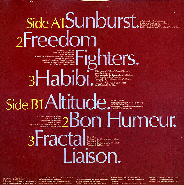 Mastered at Master Room Editing using soundtools and Studio Vision, Supplied by Dreamhire Tracks A1, A3 & D1 recorded at Marcus Tracks A1 mixed at Marcus Tracks A2, A3, B2, C1 to D3 mixed at Do Not Erase Tracks A3 & D1 engineered at Rollover & Do Not Erase Tracks A2, B2, C1, C2, D2 & D3 recorded at Do Not Erase Track B1, B3 & C3 recorded at Sam Therapy Track B1 & B3 mixed at Sam Therapy Track B3 mixed live to DAT ℗&© 1991 Ten Records Ltd. The track durations were not listed on the release Printed inner sleeves.