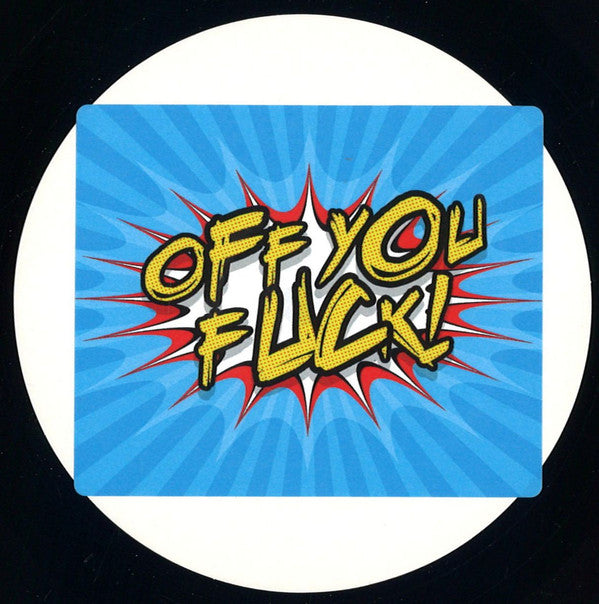 Plain white vinyl with Off You Fuck sticker on Side A (initially covering the hole) Artist, title and track names do not appear on the vinyl