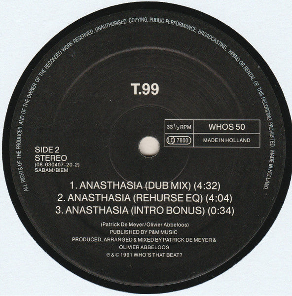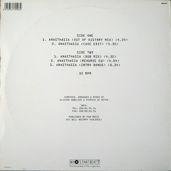 ℗ & © 1991 Who's That Beat? Made in Holland. The rear of sleeve mentions: XTC WILL DESTROY VIOLENCE! Track A1 samples: Vocal from Love Unlimited Orchestra - Bring It On Up