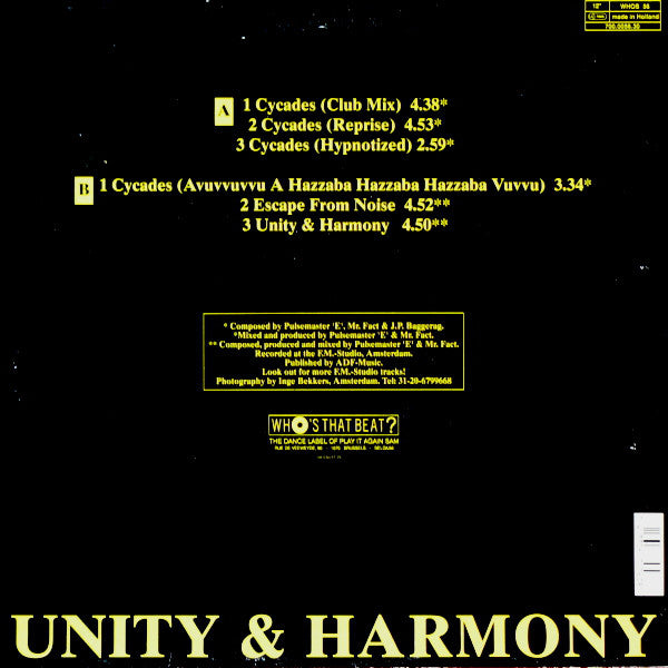 Recorded at the F.M.-Studio, Amsterdam. Published by ADF-Music. ℗&© 1991 Who's That Beat? Made in Holland. Track B4 is not credited on the release but it is a sample of the Cycades track recorded in reverse.