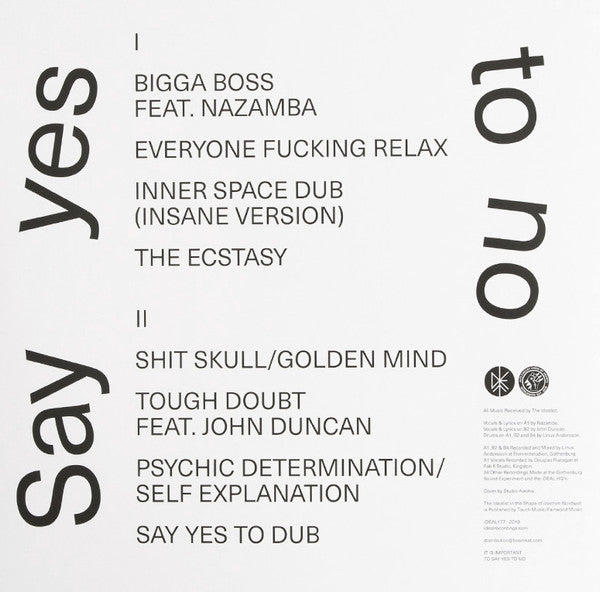A1, B2 & B4 Recorded and Mixed by [... at Elementstudio, Gothenburg. A1 Vocals recorded by [... on Fab 5 Studio, Kingston. All other recordings made at the Gothenburg Sound Experiment and the iDEAL's HQ. The idealist in the shape of Joachim Nordwall is published by Touch Music/Fairwood Music. iDEAL177 - 2019 idealrecordings.com distribution@boomkat.com IT IS IMPORTANT TO SAY YES TO NO Edition of 300 copies.