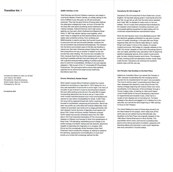 Sometimes, looking back to the tracks that have been most inspirational yields very interesting results. In the last couple of years these four tracks stood out and share a deep sonic connection. All artists produced music in the early/mid 80s, played in post-punk, experimental and EBM/industrial bands and transitioned naturally into the techno, ambient and trance sounds of the early 90s, while maintaining an elemental early 80s live feel in the process. It’s no coincidence that these tracks date back to 92-94, a time defined by rapid technological change and a major political landslide. The fall of the Berlin wall seemed to herald the dawn of a new era of peace and prosperity. The Cold War thawed, a sense of relief took hold, the West appeared victorious and the future looked bright. The emergence of rave culture seemed to embody this world of endless technological possibility and future optimism, techno-optimism indeed. Fast forward to 2019 and this optimism has obviously faded into oblivion, where the dream of universal freedom turned out be the empty promise of free market hypercapitalism beneficial to a small elite only. But thirty years ago rave culture was the product of that change and felt like a new home for those who discovered it. All these tracks are a precursor to sounds we hear today, an integral part of an ongoing cycle of trends where successive generations take over from previous ones. Rediscovery of that moment in time and sound is what Transition is all about, a collection of penultimate tracks that define that era. Track durations, manufacturer and distributor are not listed on the release itself.