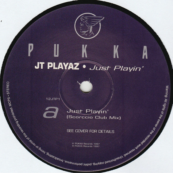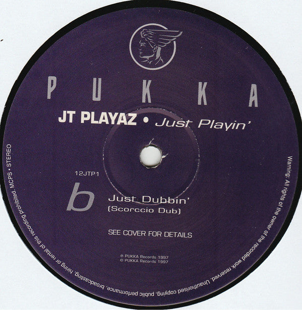 The packaging is unusual in that an outer silver card sleeve has cutouts that allow an inner purple card sleeve to be seen. The main cut out seems to be the shape of a large mythical god's head. JT Playaz would like to thank Mark Jolley and Lisa Tiltyard at Pukka Records, Anna Jolley at Strongsongs, Jo Feakes at Winding and Duane at Amato Distribution Alfie DeSilva thanks Marianne for believing (and then not believing!). Mark Summers sends special thanks to Olga. Giles Goodman sends big shouts out to Jase, Garab and no thanks to Amy. Respect to DYNAMIC for licensing JT Playaz and many other UK tracks all over the World! Also available on CD (CDJTP1) and Cassette (CAJTP1)